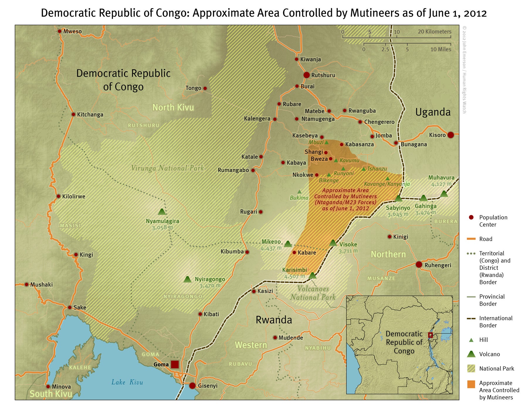 Le 3 mai, un autre officier de l’armée congolaise, le colonel Sultani Makenga, a lancé une mutinerie distincte dans l’est de la RD Congo. Makenga avait auparavant servi avec Ntaganda au sein du Congrès national pour la défense du peuple (CNDP), un ancien groupe rebelle soutenu par le Rwanda, responsable de nombreuses atrocités contre des civils en RD Congo. Un porte-parole de Makenga a déclaré dans un communiqué de presse datant du 6 mai et dans un entretien avec Human Rights Watch que Makenga n’agissait pas avec Ntaganda et que sa mutinerie, connue sous le nom de M23 en référence à l’accord de paix du 23 mars 2009 entre le CNDP et le gouvernement congolais, avait pour but de souligner les revendications de l’ethnie Tutsi et les mauvaises conditions dans l’armée congolaise.